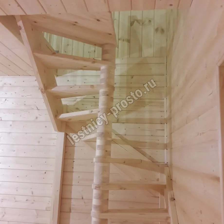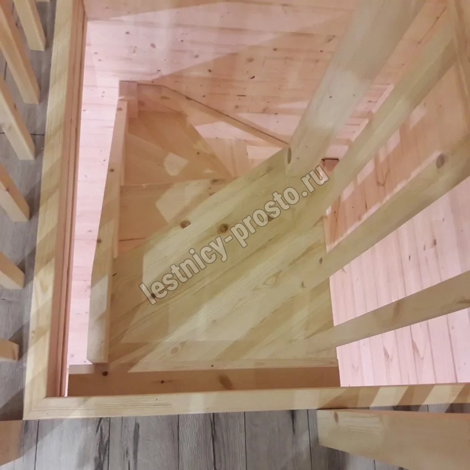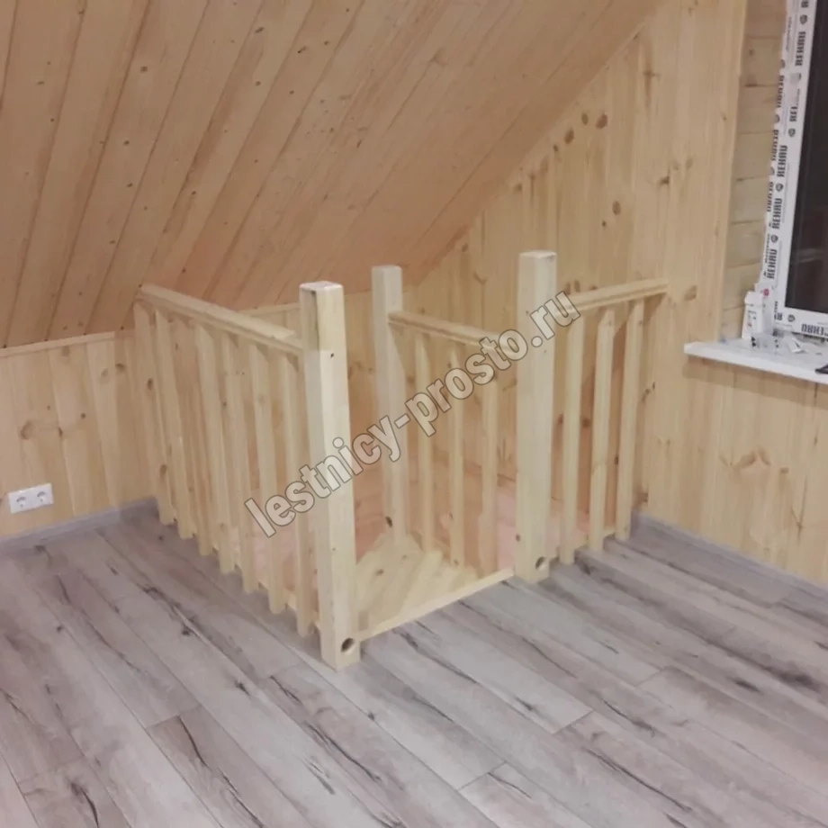 Небольшая аккуратная лестница, хорошо подойдет для помещения с небольшим проемом, поможет сэкономить пространство и организовать комфортный подъем на  уровень выше. Возможны варианты лестницы из сосны под покраску, сосны, дуба, бука или ясеня. Для увеличения срока эксплуатации мы рекомендуем покрыть элементы лестницы защитным средством. Вы можете сделать это самостоятельно или заказать предварительное покрытие необходимым средством (или тонирование) в нашем цеху.