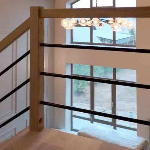 В комплекте: столбы и профильный поручень из бука без покрытия, комплект из 3 стальных ригелей (окрашены в цвет каркаса или хром по желанию) диаметром 12 мм. Ограждение начинается с пятой ступени.<br>