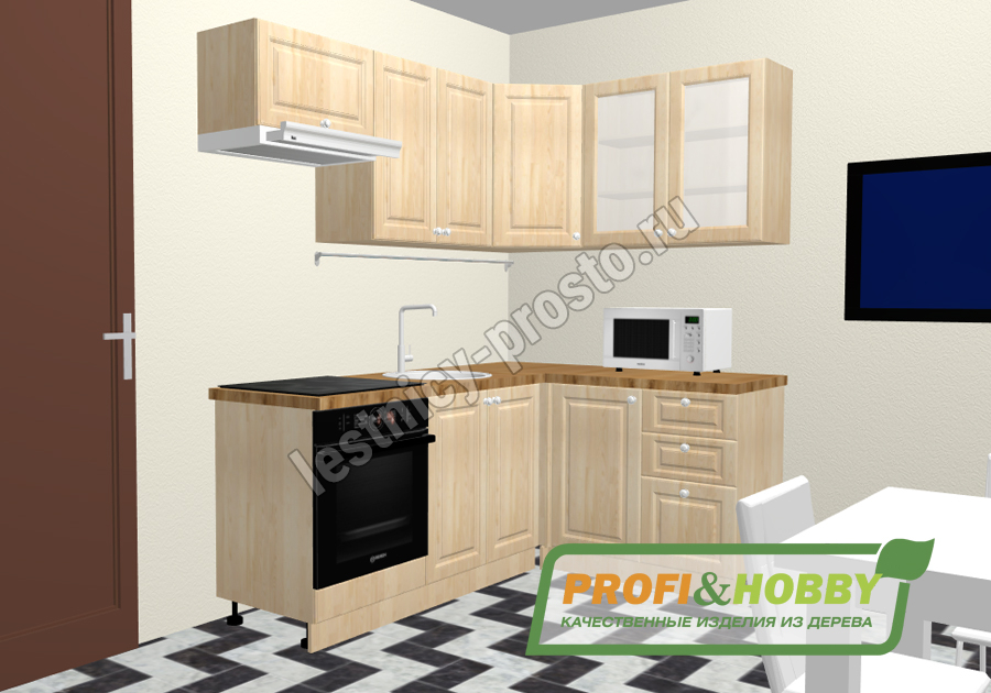 Угловой кухонный гарнитур из 100% массива сосны размером 2 на 1,4 и высотой 2,14 метра (верхние шкафчики 72 см). Цвет на выбор - 27 вариантов (при заказе кухни в нашем интернет магазине просьба указывать название цвета в комментариях).