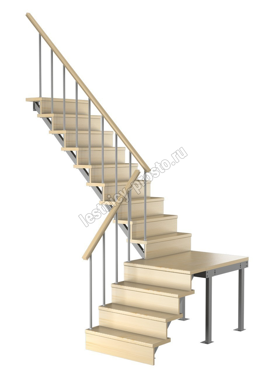 Универсальная лестница на металлическом каркасе с поворотной площадкой. Идеально дополнит любой интерьер, имеет современный вид и удобна в использовании. Монтаж осуществляется силами двух человек на объекте по указаниям, приведенным в паспорте на лестницу.