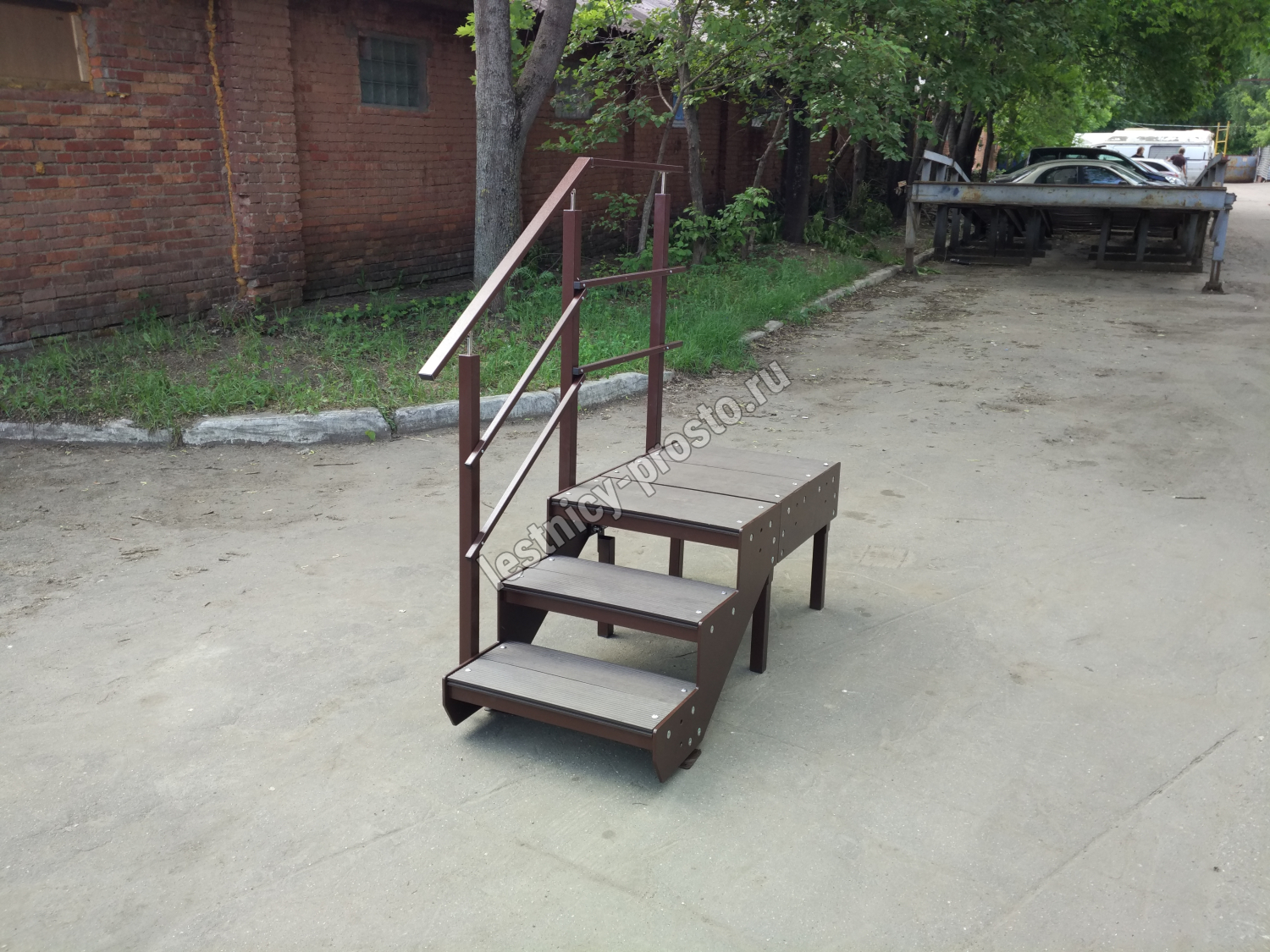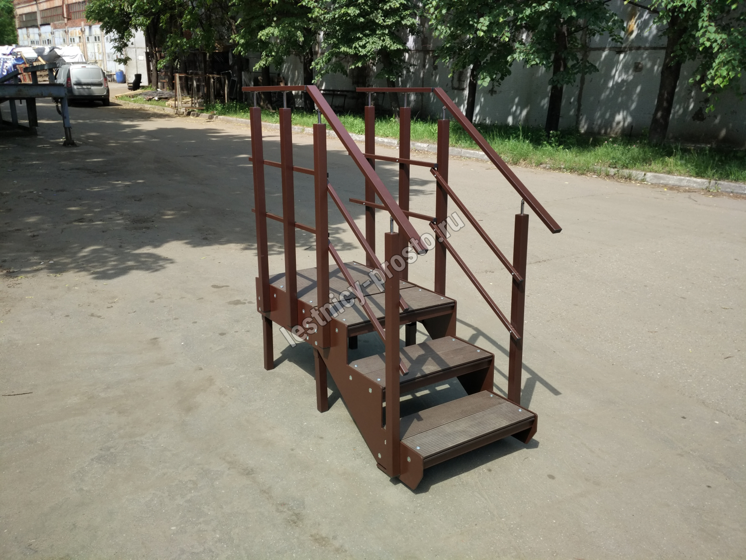 Ступени лестницы состоят из металлической рамки, обеспечивающей необходимую прочность, и покрытия из террасной доски ДПК (древесно-полимерный композит). Ступени не боятся воды и мороза, не теряют со временем свой внешний вид и не требуют ухода.