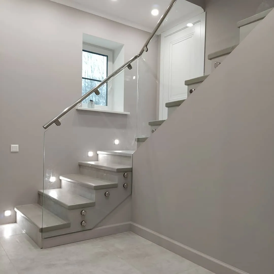 Ограждение из ударопрочного стекла с креплениями и поручнем из нержавеющей стали.