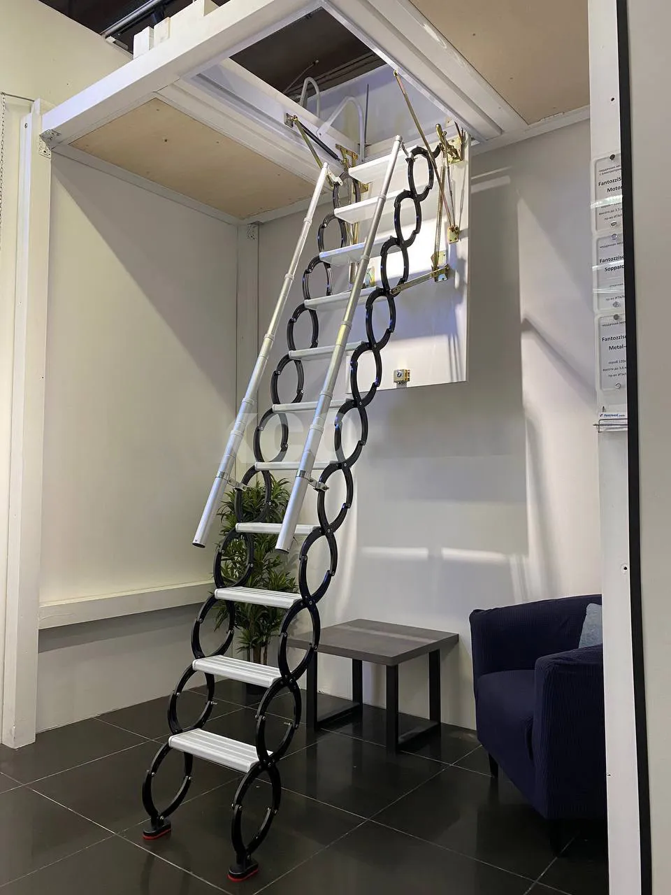 Компактная надёжная лестница. Ступени толщиной 30 мм, изготовлены из массива берёзы по технологии Multiplex, лакированные. Все металлические части оцинкованы горячим способом и покрыты порошковой краской - черного цвета; Лестница имеет надёжную несущую стальную конструкцию.