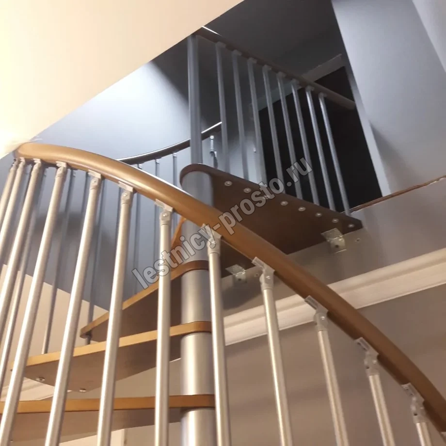 Поручень лестницы изготовлен из массива дуба в тон ступеням. Ступени и поручень покрыты износостойким защитным лаком.